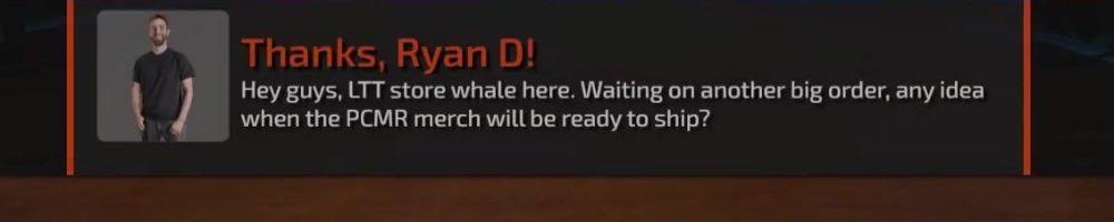 Thanks, Ryan D! Hey guys, LTT store whale here. Waiting on another big order, any idea when the PCMR merch will be ready to ship?