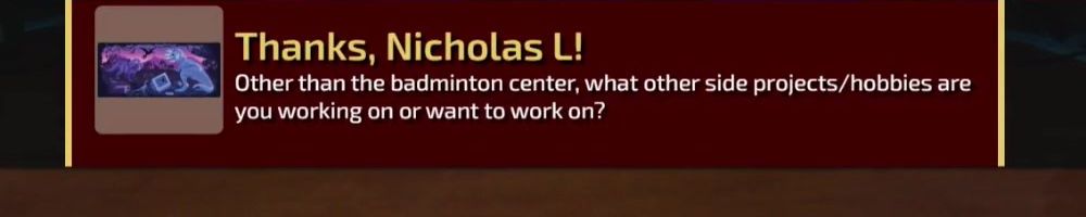 Thanks, Nicholas L! Other than the badminton center, what other side projects/hobbies are you working on or want to work on?