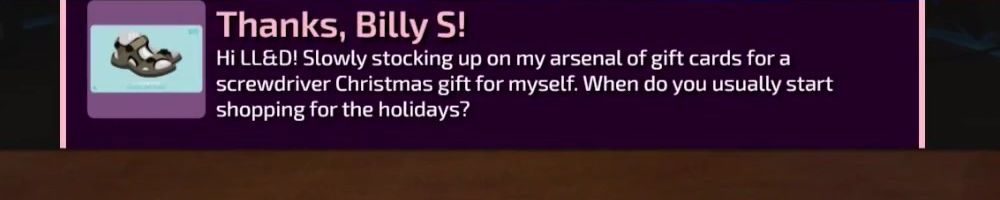 Thanks, Billy S! Hi LL&D! Slowly stocking up on my arsenal of gift cards for a screwdriver Christmas gift for myself. When do you usually start shopping for the holidays?