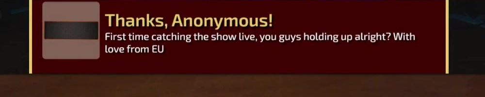 Thanks, Anonymous! First time catching the show live, you guys holding up alright? With love from EU