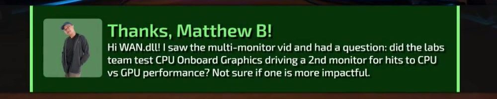 Thanks, Matthew B! Hi WAN.dLL! I saw the multi-monitor vid and had a question: did the labs team test CPU Onboard Graphics driving a 2nd monitor for hits to CPU vs GPU performance? Not sure if one is more impactful.