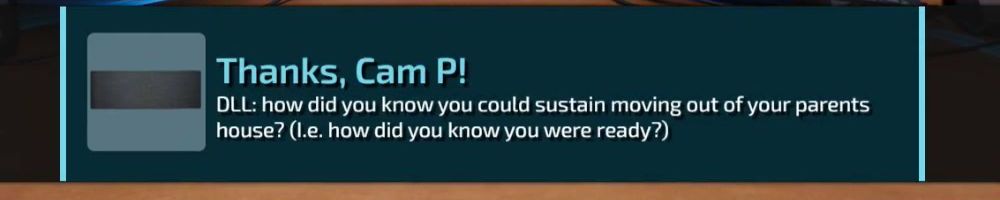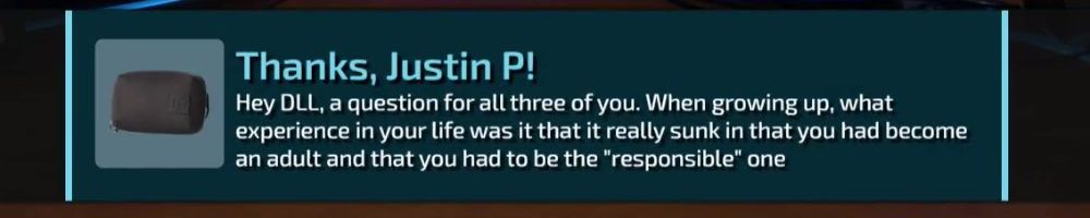Thanks, Justin P! Hey DLL, a question for all three of you. When growing up, what experience in your life was it that it really sunk in that you had become an adult and that you had to be the "responsible" one
