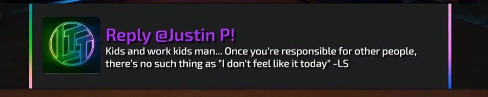 Reply @Justin P! Kids and work kids man... Once you're responsible for other people, there's no such thing as "I don't feel like it today" -LS