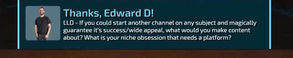 Thanks, Edward D! LLD - If you could start another channel on any subject and magically guarantee it's success/wide appeal, what would you make content about? What is your niche obsession that needs a platform?