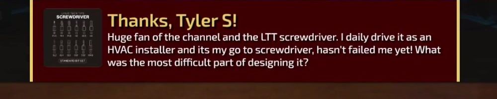 Thanks, Tyler S! Huge fan of the channel and the LTT screwdriver. I daily drive it as an HVAC installer and its my go to screwdriver, hasn't failed me yet! What was the most difficult part of designing it?