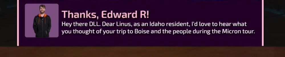 Thanks, Edward R! Hey there DLL. Dear Linus, as an Idaho resident, I'd love to hear what you thought of your trip to Boise and the people during the Micron tour.