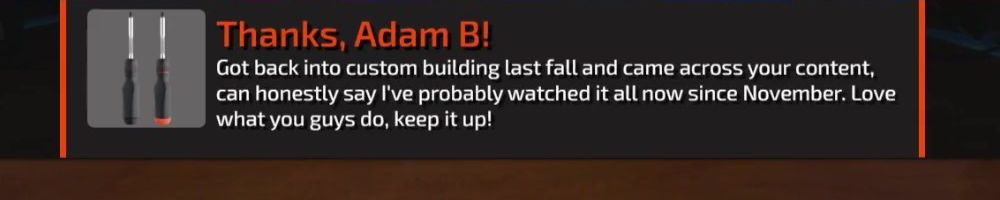 Thanks, Adam B! Got back into custom building last fall and came across your content, can honestly say I've probably watched it all now since November. Love what you guys do, keep it up!