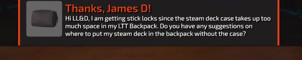Thanks, James D! Hi LL&D, I am getting stick locks since the steam deck case takes up too much space in my LTT Backpack. Do you have any suggestions on where to put my steam deck in the backpack without the case?