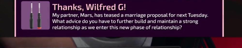 Thanks, Wilfred G! My partner, Mars, has teased a marriage proposal for next Tuesday. What advice do you have to further build and maintain a strong relationship as we enter this new phase of relationship?