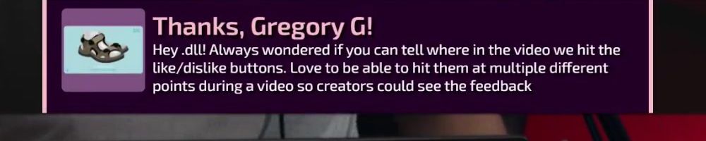 Thanks, Gregory G! Hey .dll! Always wondered if you can tell where in the video we hit the like/dislike buttons. Love to be able to hit them at multiple different points during a video so creators could see the feedback