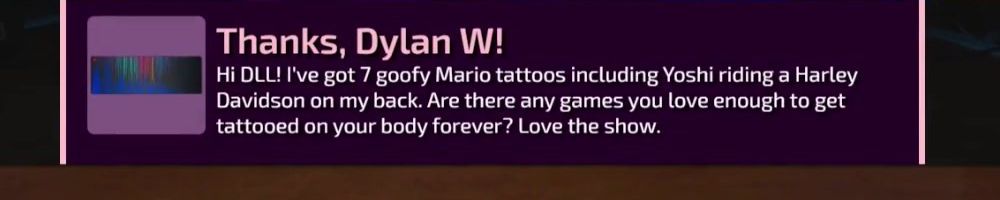 Thanks, Dylan W! Hi DLL! I've got 7 goofy Mario tattoos including Yoshi riding a Harley Davidson on my back. Are there any games you love enough to get tattooed on your body forever? Love the show.