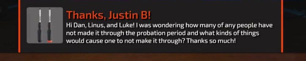 Thanks, Justin B! Hi Dan, Linus, and Luke! I was wondering how many of any people have not made it through the probation period and what kinds of things would cause one to not make it through? Thanks so much!