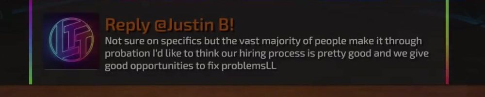 Reply @Justin B! Not sure on specifics but the vast majority of people make it through probation I'd like to think our hiring process is pretty good and we give good opportunities to fix problemsLL
