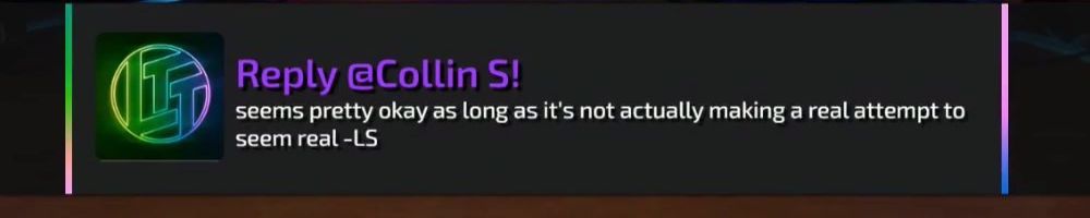 Reply @Collin S! seems pretty okay as long as it's not actually making a real attempt to seem real -LS