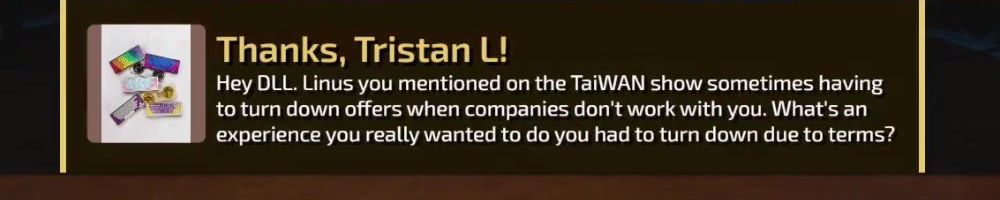 Thanks, Tristan L! Hey DLL. Linus you mentioned on the TaiWAN show sometimes having to turn down offers when companies don't work with you. What's an experience you really wanted to do you had to turn down due to terms?