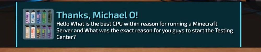 Thanks, Michael O! Hello What is the best CPU within reason for running a Minecraft Server and What was the exact reason for you guys to start the Testing Center?