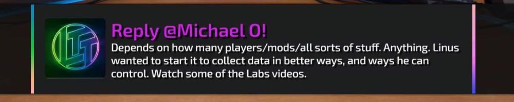 Reply @Michael O! Depends on how many players/mods/all sorts of stuff. Anything. Linus wanted to start it to collect data in better ways, and ways he can control. Watch some of the Labs videos.