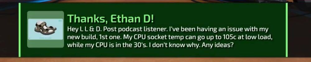 Thanks, Ethan D! Hey L L & D. Post podcast listener. I've been having an issue with my new build, 1st one. My CPU socket temp can go up to 105c at low load, while my CPU is in the 30's. I don't know why. Any ideas?