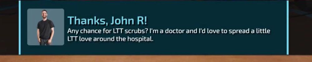Thanks, John R! Any chance for LTT scrubs? I'm a doctor and I'd love to spread a little LTT love around the hospital.
