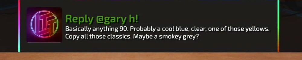 Reply @gary h! Basically anything 90. Probably a cool blue, clear, one of those yellows. Copy all those classics. Maybe a smokey grey?