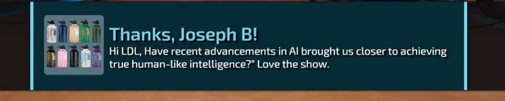 Thanks, Joseph B! Hi LDL, Have recent advancements in AI brought us closer to achieving true human-like intelligence?" Love the show.
