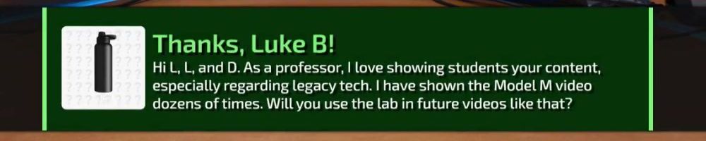 Thanks, Luke B! Hi L, L, and D. As a professor, I love showing students your content, especially regarding legacy tech. I have shown the Model M video dozens of times. Will you use the lab in future videos like that?