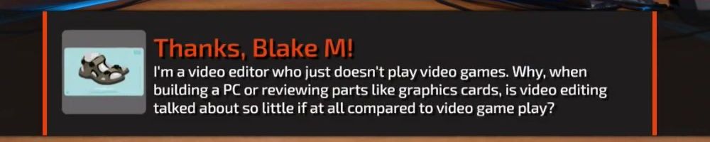 Thanks, Blake M! I'm a video editor who just doesn't play video games. Why, when building a PC or reviewing parts like graphics cards, is video editing talked about so little if at all compared to video game play?