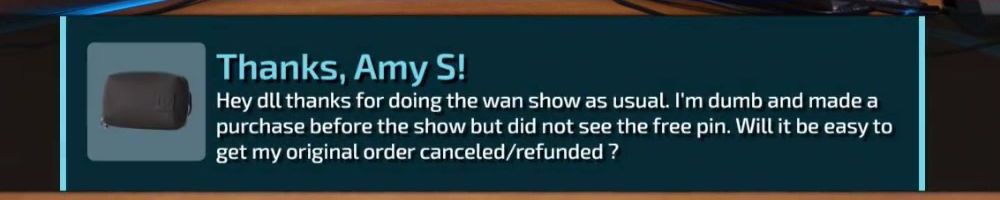 Thanks, Amy S! Hey dll thanks for doing the wan show as usual. I'm dumb and made a purchase before the show but did not see the free pin. Will it be easy to get my original order canceled/refunded ?