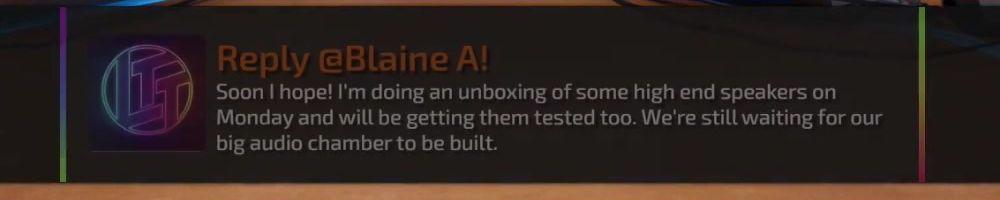 Reply @Blaine A! Soon I hope! I'm doing an unboxing of some high end speakers on Monday and will be getting them tested too. We're still waiting for our big audio chamber to be built.