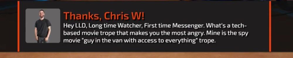 Thanks, Chris W! Hey LLD, Long time Watcher, First time Messenger. What's a tech-based movie trope that makes you the most angry. Mine is the spy movie "guy in the van with access to everything" trope.