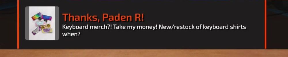 Thanks, Paden R! Keyboard merch?! Take my money! New/restock of keyboard shirts when?