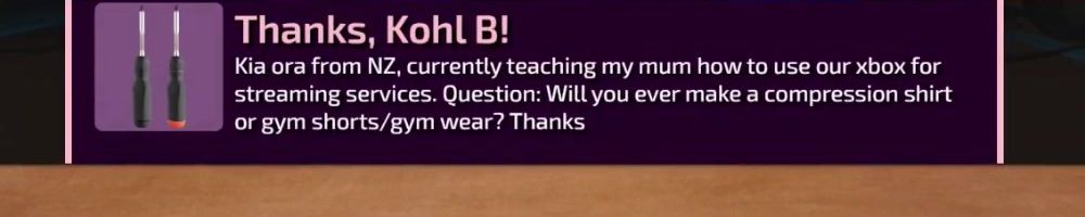Thanks, Kohl B! Kia ora from NZ, currently teaching my mum how to use our xbox for streaming services. Question: Will you ever make a compression shirt or gym shorts/gym wear? Thanks