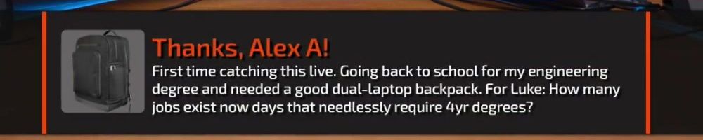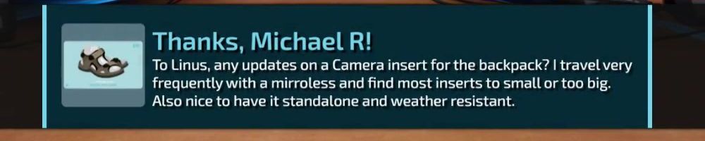 Thanks, Jarrid P! I love the pin idea, I love what you do and provide to a huge community. Keep up the great everything Luke and Linus. I still need to buy a backpack quite badly.