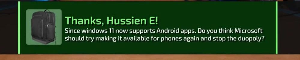 Thanks, Hussien E! Since windows 11 now supports Android apps. Do you think Microsoft should try making it available for phones again and stop the duopoly?