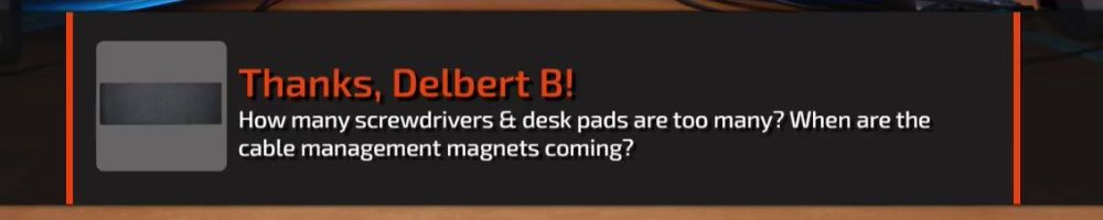 Thanks, Caleb Y! Just wanted to throw in a thank you for your content, it's helped to inspire me to get off my a** and get my room and desk and computer into working order.