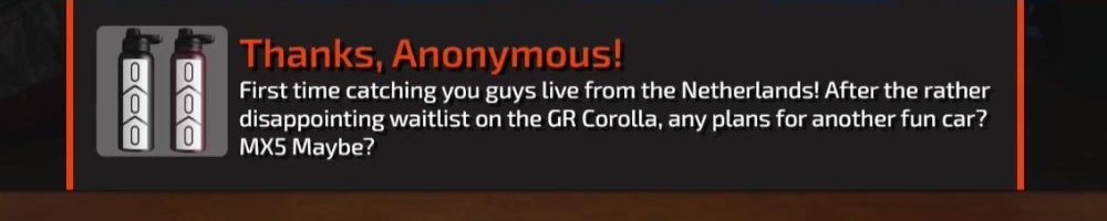 First time catching you guys live from the Netherlands! After the rather disappointing waitlist on the GR Corolla, any plans for another fun car? MX5 Maybe?
