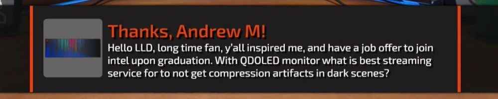 Hello LLD, long time fan, y'all inspired me, and have a job offer to join intel upon graduation. With QDOLED monitor what is best streaming service for to not get compression artifacts in dark scenes?