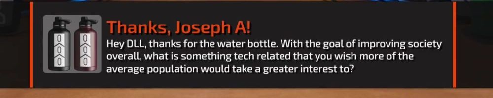 Hey DLL, thanks for the water bottle. With the goal of improving society overall, what is something tech related that you wish more of the average population would take a greater interest to?