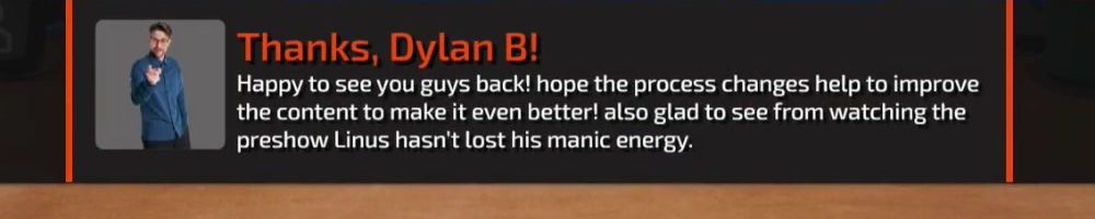 Happy to see you guys back! hope the process changes help to improve the content to make it even better! also glad to see from watching the preshow Linus hasn't lost his manic energy.
