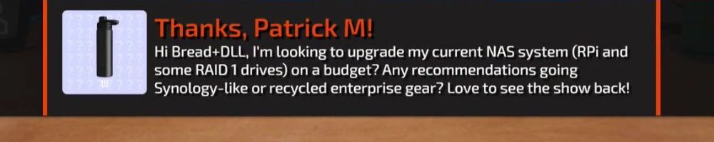 Hi Bread+DLL, I'm looking to upgrade my current NAS system (RPi and some RAID 1 drives) on a budget? Any recommendations going Synology-like or recycled enterprise gear? Love to see the show back!