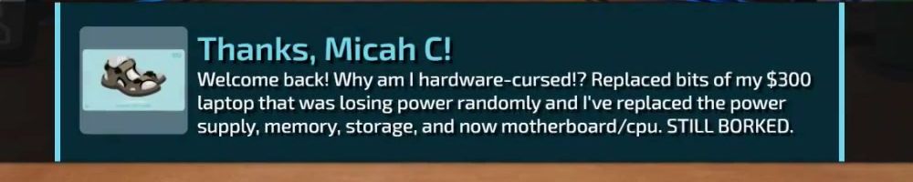 Welcome back! Why am I hardware-cursed!? Replaced bits of my $300 laptop that was losing power randomly and I've replaced the power supply, memory, storage, and now motherboard/cpu. STILL BORKED.