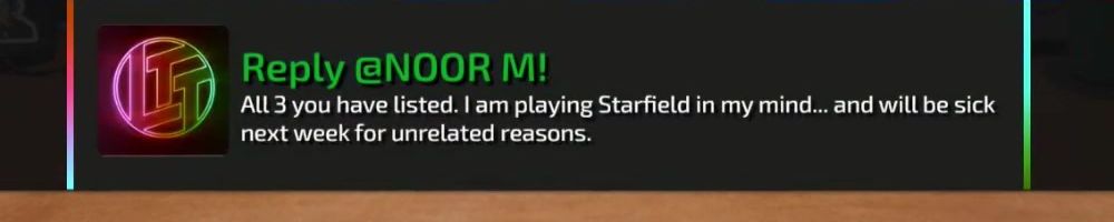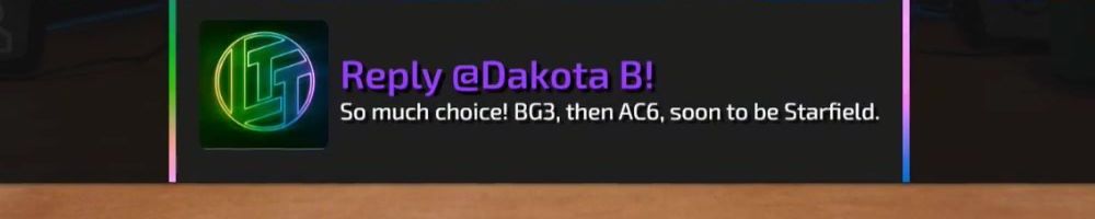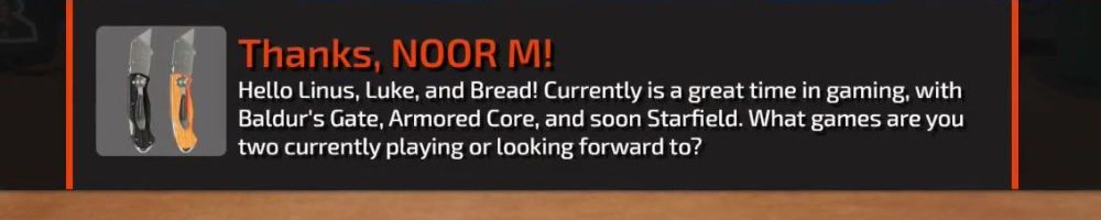 Hello Linus, Luke, and Bread! Currently is a great time in gaming, with Baldur's Gate, Armored Core, and soon Starfield. What games are you two currently playing or looking forward to?