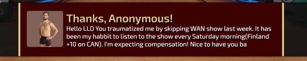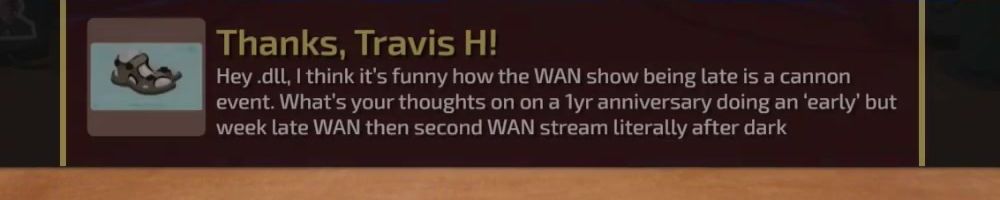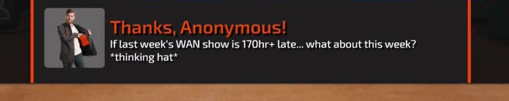 Hey dL, I think it's funny how the WAN show being late is a cannon event. What's your thoughts on on a lyr anniversary doing an ‘early’ but week late WAN then second WAN stream literally after dark