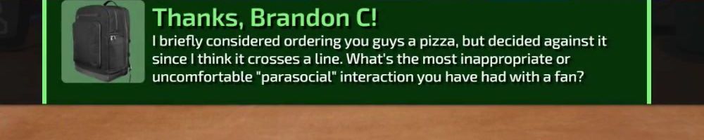 I briefly considered ordering you guys a pizza, but decided against it since I think it crosses a line. What's the most inappropriate or uncomfortable "parasocial" interaction you have had with a fan?