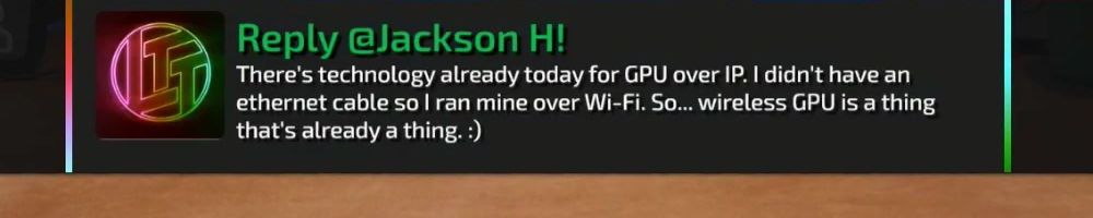 There's technology already today for GPU over IP. I didn't have an ethernet cable so I ran mine over Wi-Fi. So... wireless GPU is a thing that's already a thing. :)