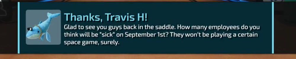 Glad to see you guys back in the saddle. How many employees do you think will be "sick" on September 1st? They won't be playing a certain space game, surely.