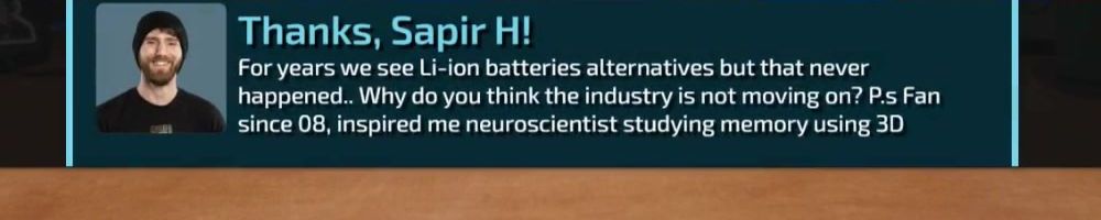 For years we see Li-ion batteries alternatives but that never happened.. Why do you think the industry is not moving on? P.s Fan since 08, inspired me neuroscientist studying memory using 3D