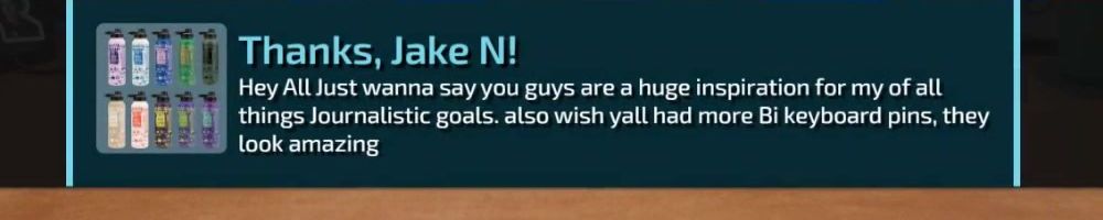 Hey All Just wanna say you guys are a huge inspiration for my of all things Journalistic goals. also wish yall had more Bi keyboard pins, they look amazing