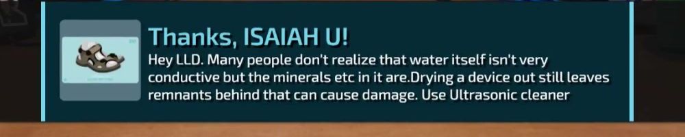 Hey LLD. Many people don't realize that water itself isn't very conductive but the minerals etc in it are. Drying a device out still leaves remnants behind that can cause damage. Use Ultrasonic cleaner