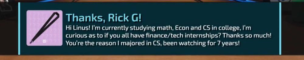 Hi Linus! I'm currently studying math, Econ and CS in college, I'm curious as to if you all have finance/tech internships? Thanks so much! You're the reason I majored in CS, been watching for 7 years!